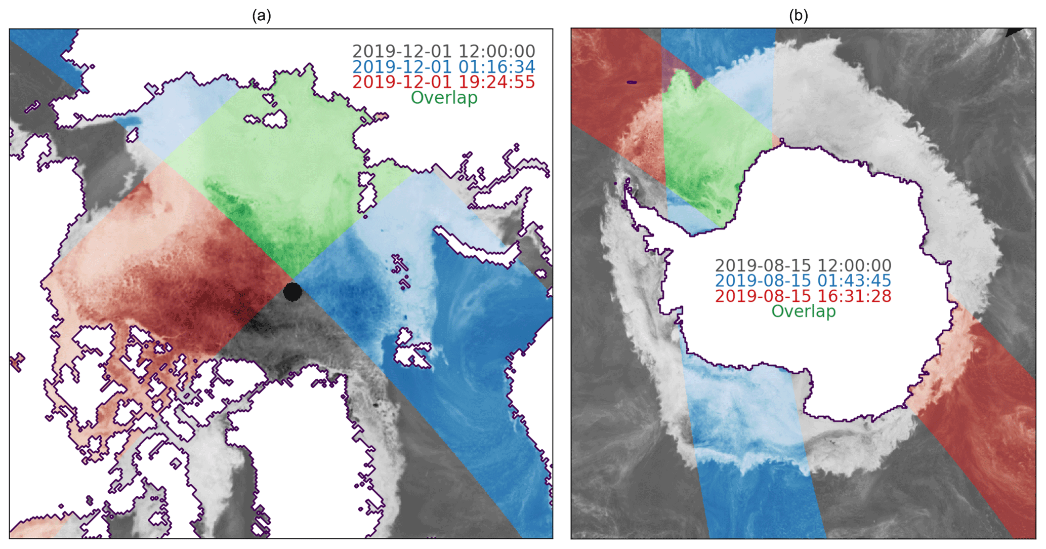 Fig. 2 (a) Daily average map of AMSR2 36.5 GHz V-pol TB on 1 December 2019 (greys) for the Arctic and two individual gridded swaths on the same day (blues: 01:16:34 UTC; reds: 19:24:55 UTC). The sea-ice region of overlap between the two swaths is highlighted in greens and is where S2S drift vectors can be computed. (b) Similar but for the Antarctic on 15 August 2019 (blues: 01:43:45 UTC; reds: 16:31:28 UTC). Reproduced from [Lavergne et al., 2021].#