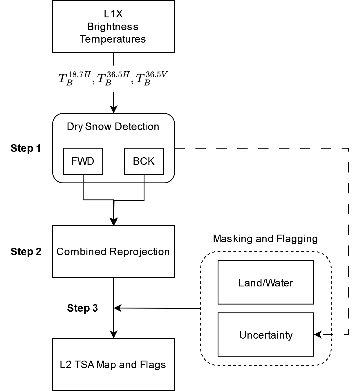 The TSA Uncertainty Flag in its current form is based on the gridded forward (FWD) and backward (BCK) TSA maps. Grid cells which see detected snow for both scans (FWD & BCK) are flagged as ‘very likely snow covered’, whereas detected snow for one scan only (FWD | BCK) are set to ‘likely snow covered’. If no snow is detected for both scans (FWD & BCK), the flag reads ‘very likely snow free’. The Status Flag contains information for each grid cell whether its spatial location corresponds to open water, land, or snow-covered land (valid dry snow), and indicates cells with missing data or out of grid.