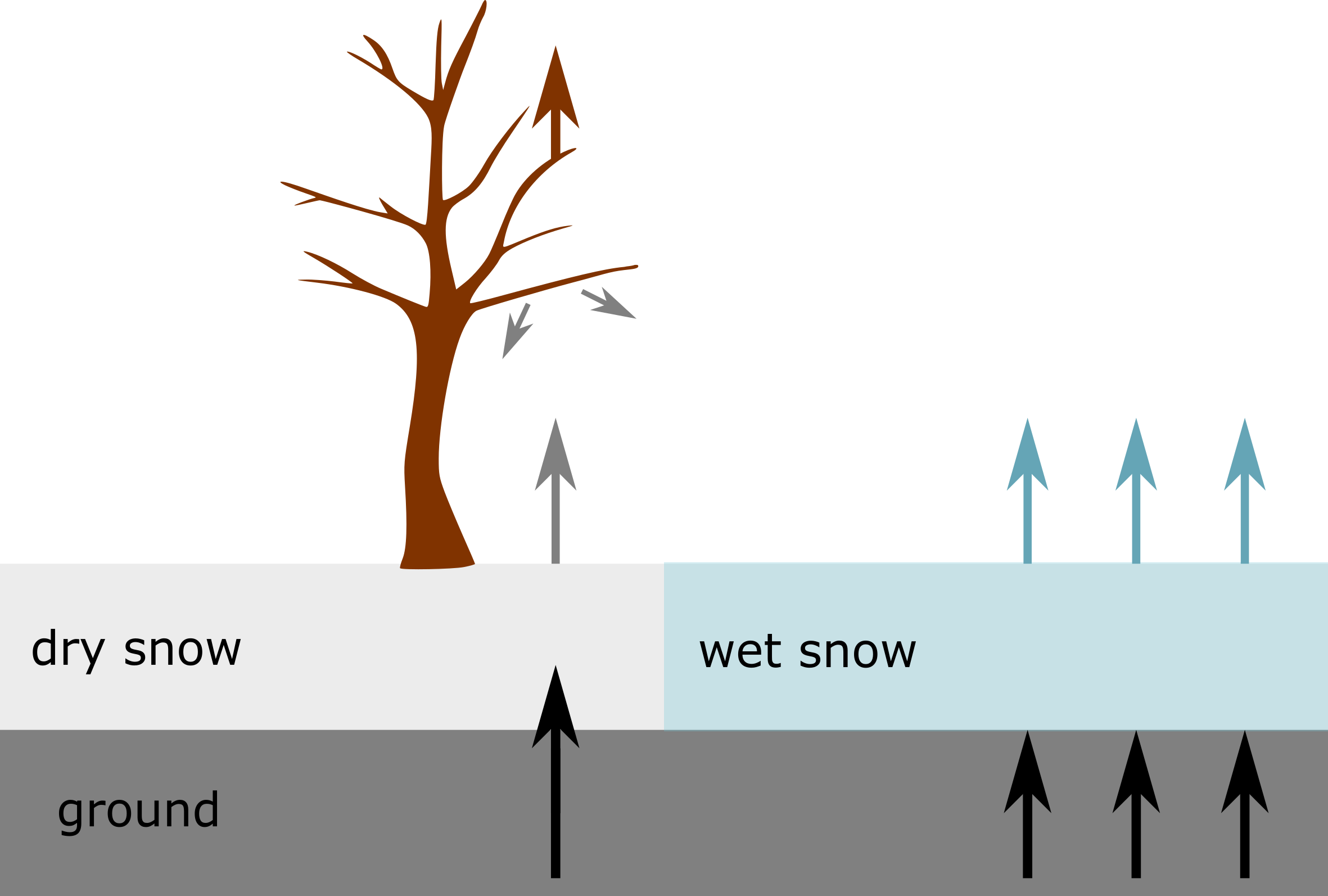 Liquid water similarly poses a key challenge in form of water bodies. For that reason, large waters such as oceans and large lakes are commonly masked out, as are pixels that cover large percentages of water e.g. in coastal areas or lakeland. Another problem is that most of the Earth’s seasonal snow cover occurs in complex landscapes. Firstly, mountainous terrain hinders snow detection since large spatial differences in snow depth are to be expected: whilst deep snow eventually reaches saturation depth, the signal of areas with shallow snow prevails which may be mistaken for bare ground. And secondly, the changes in slope gradient within the sensor footprint cause variations in (local) observation angle and thus in view-dependent emissivity which again may be falsely identified as snow-free conditions. Besides, overlying vegetation reflects upwelling microwave radiation and emits some on its own [Grody and Basist, 1996], as illustrated in Fig. 2. Snow cover in forested areas consequently presents higher emissivities and brightness temperatures than in unforested regions.