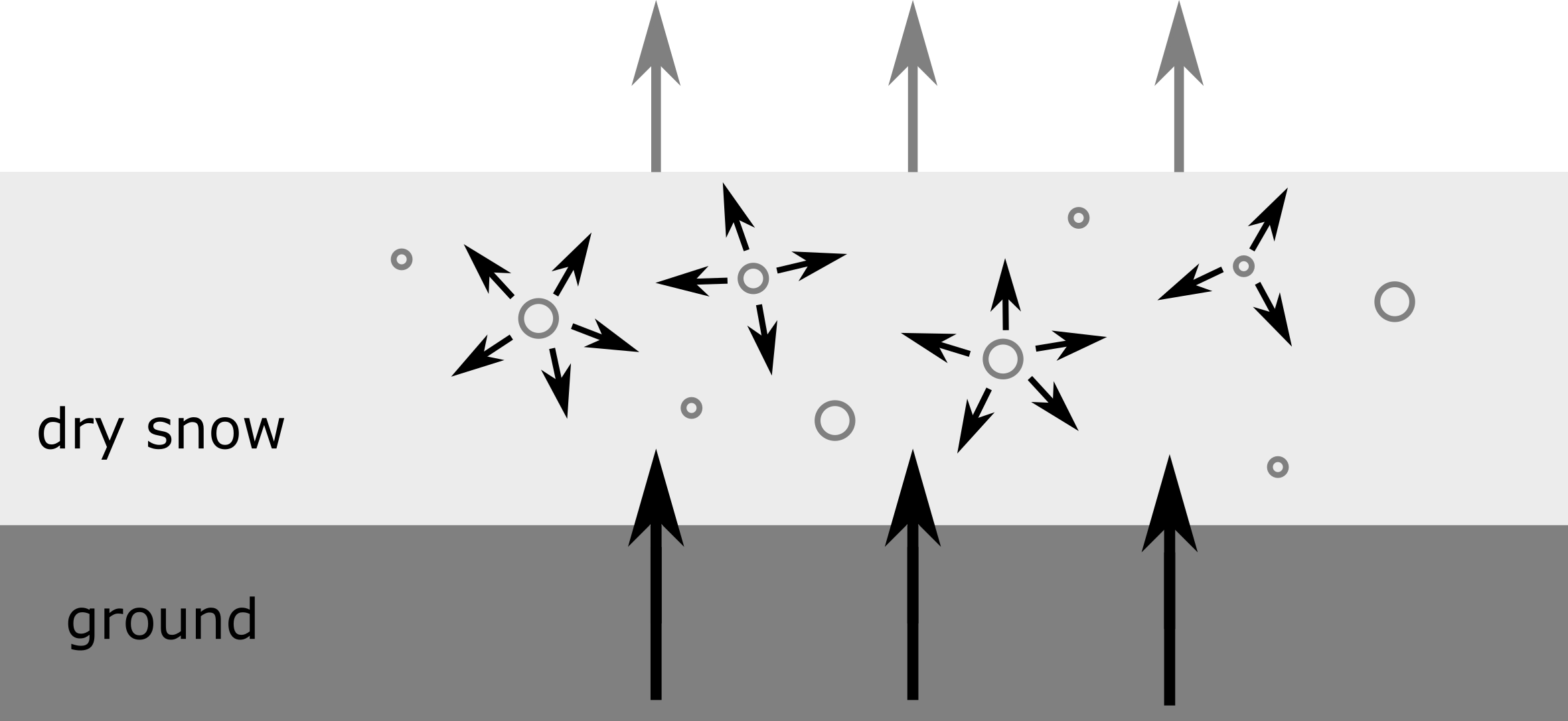 Volume scattering, the dominating type of attenuation as observed for dry snow, is highly dependent on frequency. Air acts as a surrounding medium for the ice particles with diameters on the order of millimetres. For propagating waves with wavelengths noticeably larger than this, snow appears as a homogeneous medium with only absorptive effects. For wavelengths of similar magnitude, the ice particles act as scatterers due to the inhomogeneous dielectric properties between the ice itself and the air background [Ulaby and Long, 2014]. This scattering mechanism is illustrated in Fig. 1. The phenomenon that the emissivity of snow-covered ground decreases with increasing frequency, is unique among land cover types and is directly influenced by the snow’s properties [Mätzler, 1994]. The impact of wavelength on scattering behaviour can be applied to snow grain size: the higher the frequency and/or the larger the grains, the more scattering is observed as the particle size approaches the wavelength. Snow density has a similar effect to grain size and since both generally increase for aging snow, older snowpacks result in more attenuation. A further aspect to consider is snow depth, given deeper snowpacks naturally allow for more scattering to take place.